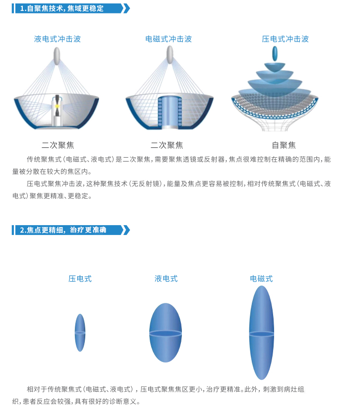 压电式聚焦冲击波,是传统冲击波的升级时候,在骨病、深部疾病、肌腱结尾病等方面,具有发散式冲击波不具有的上风。相对传统聚焦式冲击波(电磁式、液电式),压电式冲击波具有聚焦焦斑更细巧、靶向性更强、雄厚性更强、使用寿命更长、珍摄本钱更低等上风,在临床得到越来越豪迈的眷注与期骗。